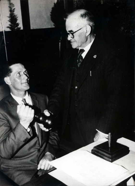 HISTORYThis photograph shows the older man, Cr William Graham Myers, handing the gavel to Cr Douglas Maxwell Thompson, upon his election as the first president of the Shire of Hastings on 06/11/1960.