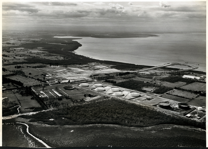 DESCRIPTIONThis image shows a large industrial site with eight large tanks. A large section of prepared ground is at the centre of the image. A road leads out onto a circular wharf in the water. Water and a shoreline are at the top left-hand section of the image. Paddocks, trees and a creek can be seen.