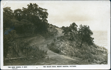 DESCRIPTIONThis postcard shows a winding dirt road climbing a hill. Native trees and shrubs are on either side. A bank is on the left-hand side and the land slops down to the water on the right-hand side. A wooden foot bridge is in the foreground on the left. Printed across the bottom of the postcard is: “The Rose Series, P. 2074 Copyright The Beach Road, Mount Martha, Victoria”.