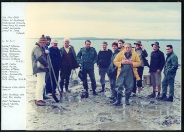 HISTORYThis group of men are searching for practice shells from the Armstrong 40 pound gun on Long Island for the Hastings-Western Port Historical Society. The names of the men, from left to right, are as follows: “Lionel Elmore, Geoff Allman, Bruce Alderson, Doug Thompson, Petty Officer Steven Collins R.A.N., Keith Cole, David Mason, Andrew Allman, Norm Francis, Peter Ainsworth, Gaza Shaw and Matt Hurley, R.A.N. Missing from the photograph are John Woolley, who took the photo and Bill Patience, Edwin Mawson and Tim Long. The men in the boat in the second photo are Edwin Mawson in the yellow coat and Jim Harris in the dark hat.