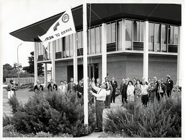 DESCRIPTIONThis image shows a large group of approximately thirty-one people standing watching a man raise a white flag. Printed on the flag is: “Award of Merit”, a partly visible symbol and a map of Australia inside a circle. The man raising the flag is wearing a long sleeved white shirt, tie, dark trousers and a cap. Most of the men are wearing suits. There are only two women in the group. Shrubs are on either side of the flag pole. A two story building with white posts is behind the group. The walls of the top floor of the building are made up of long glass windows. A tall pole with a light and fencing can be seen to the far left of the image.