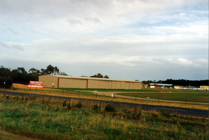 DESCRIPTIONThis image shows a very long shed beside green grass and a smaller shed behind it to the right. A number of small aircraft is sitting on the grass. Green grass is in the foreground. Post and wire fences are on either side of a bitumen road and a curved gravel road is running down beside the large building. Tall trees are in the background. Red signs with white printing which reads: “Peninsula Aero Club Westernport Airfield” is on the left-hand side beside the bitumen road.