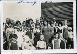 DESCRIPTIONThis image shows a large group of approximately twenty-five children and three adults posing for a photo beside a weather-board building. They are all dressed in swimming attire. The three adults, two men and one woman are standing in the back row. Part of a jetty with people and boat masts can be seen in the background. Written in ink at the top of the photograph is: “Hastings - 32”.
