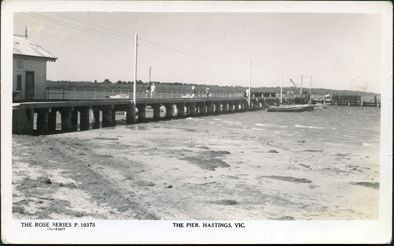 DESCRIPTIONThis image shows a pier jutting out into the water with a sandy foreshore in the foreground. Boats are on either side of the pier and several people are walking along it. Power lines are running alongside the pier between four tall white poles. Part of a shed is visible on the far left-hand side of the image. Land and trees can be seen in the distance. Printed across the bottom is: “The Rose Series P.10375 Copyright The Pier, Hastings, Vic.”