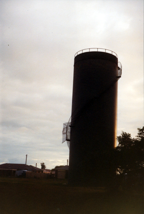 DESCRIPTIONThis photograph shows a large water tower at the centre of the image with trees to the right and houses to the left. The tower has steps going from the bottom left of the tower, across the middle to the top right. A railing is around the top of the tower.