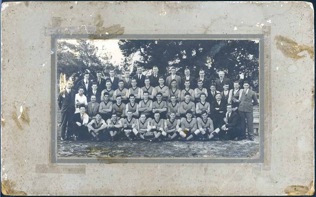 HISTORYThis is the Somerville Premiership Football Team of 1929. Their names are as follows: Back Row: S. Gregory, J. Cousens, J. Quade, P. Thornell, H. Firth, W. Lamont, H. Brown, T. White, A. Jessup, C. Moore. 3rd Row: C. Martin, W. Craig, J. Unthank, E. McConville, T. Pearce, N. Plant, L. Pitt, K. Wood, S. Clarke, J. Slack, A. Thornell, G. Bird, R. Thornell. 2nd Row: I. Incigneri, S. Thornell, Dr Bickart, C. Harding, J. Gregory, S. Callinan, M. O’Rielly, R. Grant, H. Nilsson, J. Woods, J. Sage. Front Row: F. Maslen, C. Isles, N. Unthank, R. Jessup, J. Sullivan, W. Thornell, M. Jouning, C. White, G. Grant, E. Willman. These names have been printed on a piece of writing paper and taped to the back of the photograph. Printed on the back in black pen is: “B. Maslen Somerville.”. A large splash of blue ink has been spilt on the back. Pearce