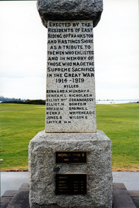 DESCRIPTIONThis image shows a section of a war memorial with inscriptions. The top section reads: “Erected by the residents of East Riding of Frankston and Hastings Shire as a tribute to the men who enlisted and in memory of those who made the supreme sacrifice in the Great War 1914-1919”. The names of the men killed are printed underneath. Two other small black plaques with gold printing are in the lower section of the monument. The monument is sitting on a two-step concrete base. Green lawn is in the background and water can be seen in the far background.