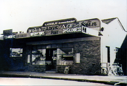 DESCRIPTIONThis image shows a brick shop front with an awning over the footpath. Large windows are on either side of the front door and a set of small windows are above. The signage at the top of the building is in three layers. The back section reads: “M. Mentiplay Aurthorized NewsAgent”. The middle section reads: “Herald Read The Argus Age The Sun”. The front section reads: “Leader Listeners Weekly Times Post Globe”. An advertising board is leaning against the shop on the footpath and two bicycles can be seen at the right-hand side of the footpath.