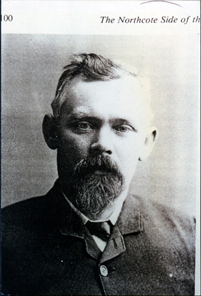 DESCRIPTIONThis image shows the head and shoulders of a man. He is looking straight at the camera, but not smiling. He has a thick greying moustache and beard. His greying hair is parted on the left side. He is wearing a white shirt, black tie and his dark coloured coat is buttoned up almost to the neck. Printed across the top of the photograph is “00 The Northcote Side of th’.