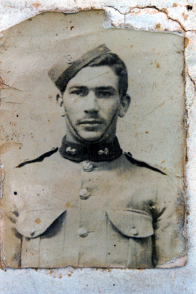 DESCRIPTIONThis is a portrait of a soldier in uniform, taken from the chest up. His uniform jacket has three large buttons and two large buttoned up front pockets. The jacket has a dark collar and epaulettes. His cap has a strap under the chin and is tilted to one side. He has a serious look on his face.