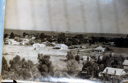 DESCRIPTIONThis image shows a township taken from an elevated position. There is undeveloped land on the left and houses on the right and across the middle of the image, set amongst the trees. There is a large double gabled building in the centre with a street running in front of it. Trees are in the foreground and water can be seen in the background. Land can be seen in the far background.