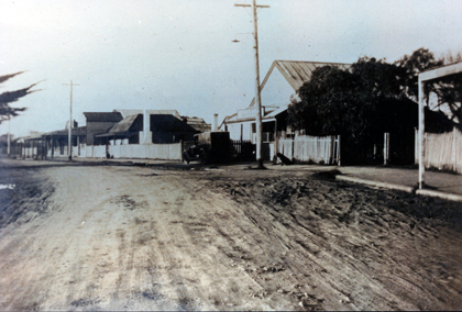 DESCRIPTIONThis image shows a wide unmade road with buildings along the right-hand side. Three power poles can be seen along the footpath. A house with a white chimney is at the centre of the image. A motor vehicle is parked on the footpath. A white paling fence is in front of most of the buildings. Verandah posts can be seen on the buildings at the end of the road. A dog is sitting on the footpath near the first pole.