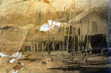 DESCRIPTIONThis image shows a row of boats moored at the side of a pier. They all have tall masts. A wooden shed is on the pier on the right-hand side of the image. A door and two windows can be seen on the shed. It has a scalloped facia board and a gable finial.