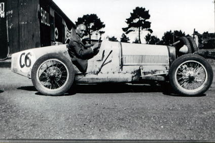 DESCRIPTIONThis image shows a man sitting in a racing car and smiling for the camera. The hair on the sides of his head is grey and he is wearing a white shirt and a suit coat. The car has ‘C6’ painted on the side at the rear. Two spare tyres are mounted at the front of the vehicle. A long lever is on the side of the vehicle near the running board. Part of a galvanized iron shed is behind the racing car on the left-hand side of the image. The words ‘shell’ and ‘castrol’ can be seen on the side of the shed. Tall trees are in the background and gravel on the ground in the foreground.