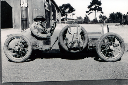 DESCRIPTIONThis image shows an elderly man sitting behind the wheel of a racing car looking at the camera. He is wearing a light coloured coat and a battered hat. He has a pipe in his mouth. The car has a spare wheel attached to the side of the car and a rucksack is attached to the wheel with a leather strap. A galvanized iron shed is behind the car on the left-hand side of the image. Signs can be seen along the side wall of the shed including the word ‘shell’. A small tank at the front of the shed also has the word ‘shell’ painted on it. Two tall trees and other buildings can be seen the background and gravel is on the ground in the foreground.