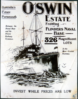 DESCRIPTIONThis image is a photograph of a brochure. At the centre of the image is a drawing of a naval ship with an Australian flag flying. The writing on the brochure reads as follows: from top right: “Australia’s Future Portsmouth Oswin Estate fronting Flinders Naval Base 326 Magnificent Lots In the Most Coveted Positions Invest While Prices Are Low Between the Naval Base and the Future Railway Terminus”.