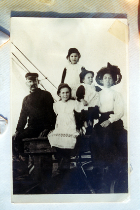 HISTORYThis is the Peterson family, Peter and Celena with children Ellen, standing at the back, Daisy, sitting and Joe. They are sitting on Peter’s crayboat. The family returned to Stony Point in 1908 and Peter operated his fishing boat from in front of their home. This photograph comes from the E. Barnes Album, courtesy of Alwyn Barnes.