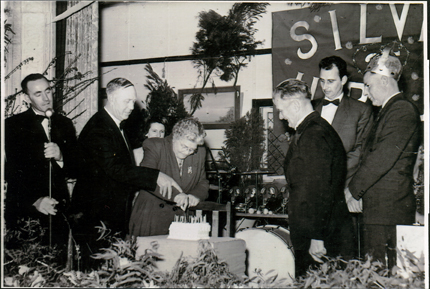 DESCRIPTIONThis image shows a woman cutting a cake, assisted by a man standing on her right. A man is standing on the far left-hand side behind a microphone. Three men are standing watching the proceedings on the right and part of a woman can be seen in the background. Everyone is dressed in formal attire and the man on the far right is wearing a ‘crown’ on his head. Large letters ‘S I L V’ are on a banner on the wall and the room is decorated with leaves and branches.