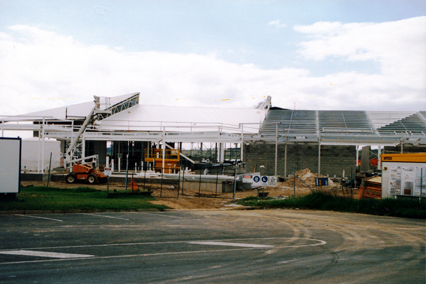 DESCRIPTIONThese seven photographs all depict the construction of a large steel framed building. Various pieces of machinery and motor vehicles are on the building site including a cherry-picker and a crane with “IBM Cranes Kato” printed along the side. Two small sheds with “ATCO” printed on the side are also on site. One image shows picnic tables also a children’s playground.