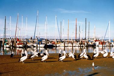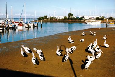 DESCRIPTIONThese three images show a large number of boats along the side of a long jetty leading into the sea. The boats all have tall masts. A muddy foreshore is in the foreground where a large number of pelicans and seagulls have landed. Land can be seen in the far distance. On image P737.3, two large sheds can be seen with tall masts behind them. Other boats are moored on the far right-hand side in an inlet.