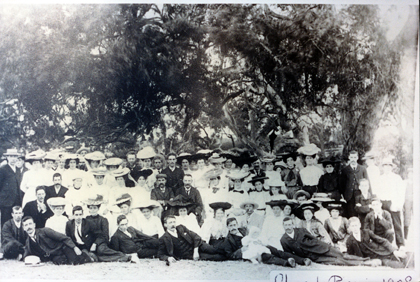 DESCRIPTIONThis image shows a large group of very well dressed men and women sitting and standing in front of large trees, posing for a photo. There are approximately sixty people. All the women are wearing hats and the men are wearing three-piece suits. Seven men are half lying on the grass in the front row. They are leaning on their right elbows. A man, third from the left is holding a baby on his lap.