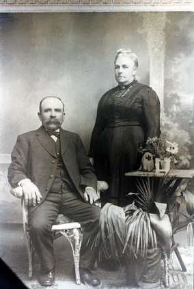 DESCRIPTIONThis image is a studio portrait of a man and a woman. The man is sitting on a cane chair with his arms resting on the arms of the chair. He is wearing a three piece suit, white shirt and bow tie. He has a large moustache and receding hair. The woman is standing to his right behind a small table. A small vase of flowers is on the table. She is wearing a long-sleeved black dress with a lace insert at the neck. A brooch is pinned at the neckline. Her fair hair is pulled upwards and pinned at the top. A small potted palm tree is in the foreground on the right-hand side.