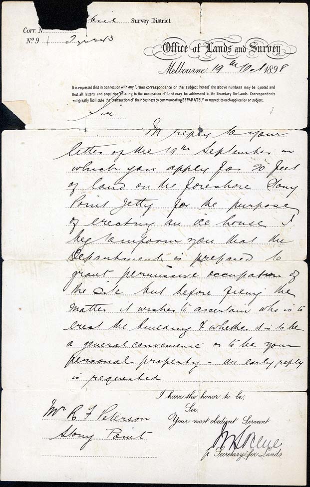 DESCRIPTIONA letter written to Mr R F Peterson by the Secretary of Lands in reply to an application for the lease of a piece of land on the foreshore at the Stony Point jetty for the purpose of building an ice-house. The addressee’s name and place is at the bottom of the letter and the letter is dated Melbourne 19th October 1898 and signed by a proxy for the Secretary of Lands whose signature is illegible.