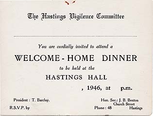 DESCRIPTIONAn invitation card from the Hastings Vigilence Committee to attend a welcome-home dinner at Hastings Hall. Card is unaddressed and is dated 1946. President: T. Barclay, Hon. Sec. J. B. Benton. “Jean Peters” is handwritten on the back.