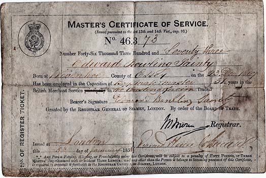 DESCRIPTIONA Master's Certificate of Service, no. 46.373, issued to Edward Bowling Sainty, born 23 Dec. 1807, for service in the British Merchant Service. The certificate was issued by the Registrar General of Seamen, London, on 8th January 1851.