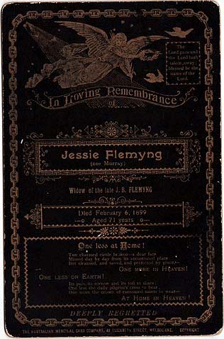 DESCRIPTIONA funeral card for Jessie Flemyng (nee Murray), widow of the late J. B. Flemyng, died February 6, 1899, aged 71 years