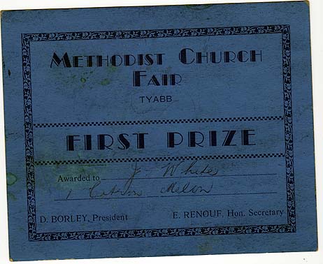 DESCRIPTIONA first prize certificate awarded by the Methodist Church Tyabb at their fair to J. White. D. Borley, President, E. Renouf, Hon. Secretary. Certificate is undated