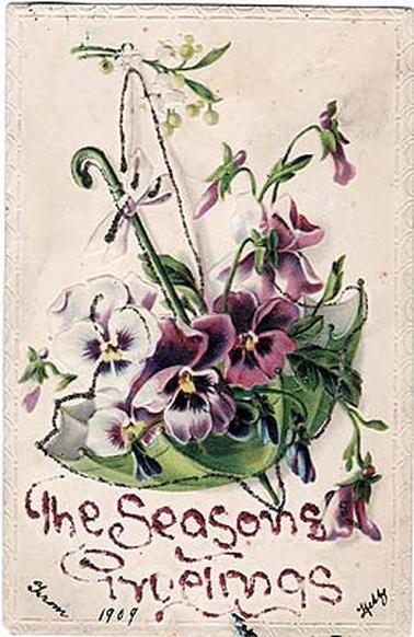 DESCRIPTIONPostcard also doubling as a Christmas card, with “The Seasons Greetings” written in purple at the bottom. Handwritten in ink on the front “From Hetty 1909” and on the back “Miss Lily Auld”
