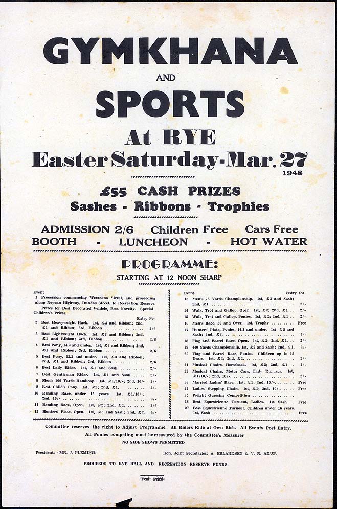 DESCRIPTIONGymkhana and sports at Rye programme, held on Easter Saturday, Mar. 27, 1948. President: Mr J. Pleming, hon. joint secretaries: A. Erlandsen & V.R. Axup