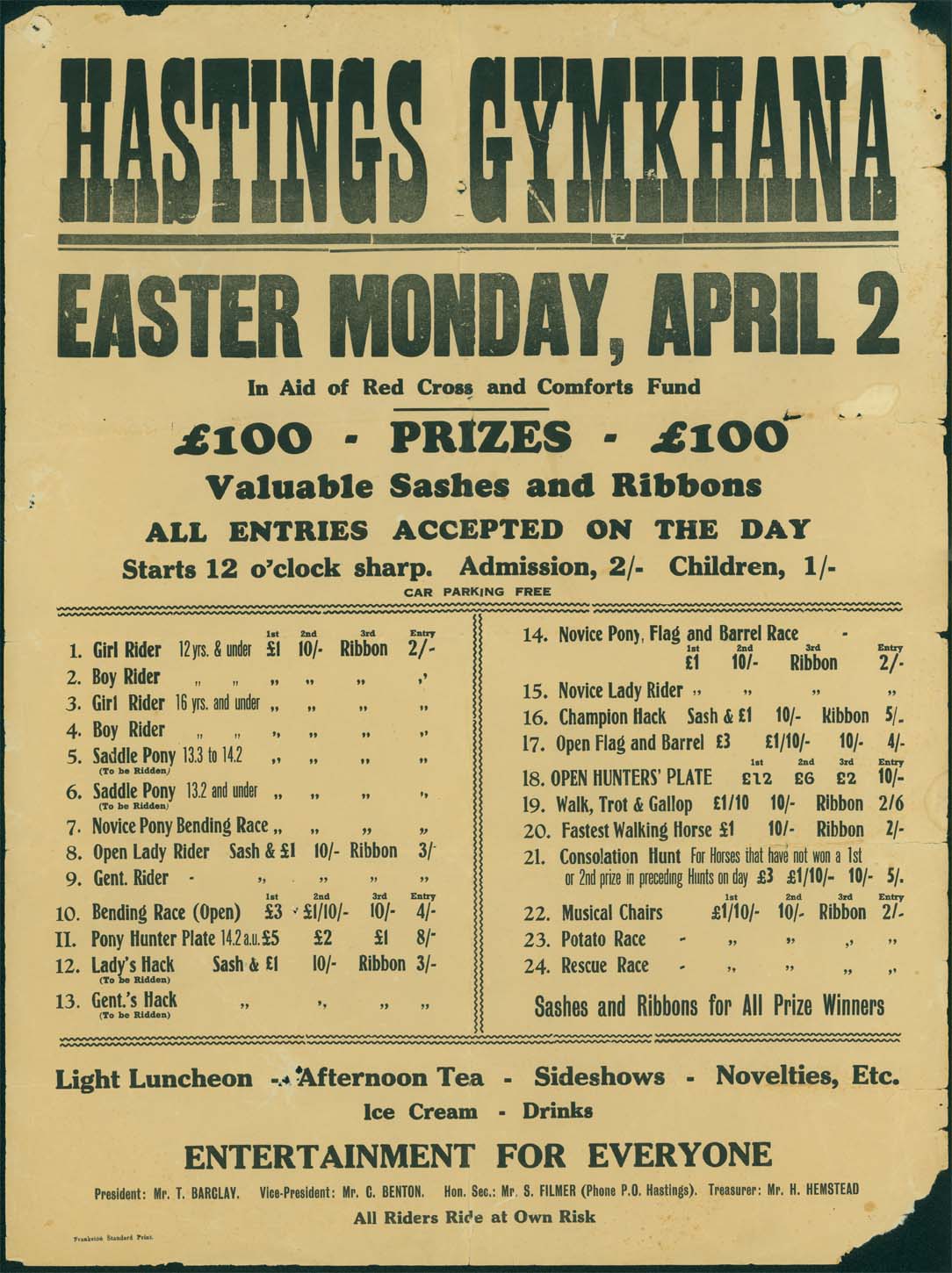 DESCRIPTIONPoster and programme for Hastings gymkhana, held on Easter Monday, April 2. Undated, but assumed to be in the 1940s. President: Mr T. Barclay, vice-president: Mr C. Benton, hon. sec.: Mr S. Filmer, Treasurer: Mr H. Hemstead