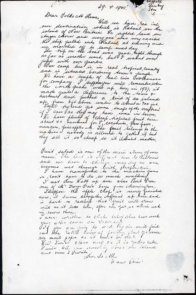 DESCRIPTIONFirst piece is a photocopy of a telegram sent from Bonegilla in Victoria by Clive Duffield to Mrs A. Duffield of Hillside, Bittern. Datestamped 16 Apr 41. Text reads “Marching out tomorrow will write love Clive” Second and third pieces are photocopies of letters sent by Clive Duffield to his family from Rabaul in New Guinea on 29/4/1941 and 10/1/1942, describing general life and conditions. Fourth piece is a photocopy of a telegram sent to Mr. F.H. Duffield by the Minister for the Army announcing that Clive Duffield was missing, presumed dead. Top right hand corner with the date has been torn away. Fifth piece is a photocopy of the Certificate of Death on War Service for Clive Duffield, dated 31st May 1946