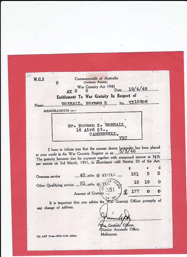 DESCRIPTIONPhotocopy of the entitlement to war gratuity in respect of Norman S. Worrall, regimental number VX18906, issued under the War Gratuity Act 1945 and listing the amount of gratuity for the number of months served. Dated 19/4/1948 and addressed to Mr. Norman S. Worrall of 16 Aird St., Camberwell, Vic.