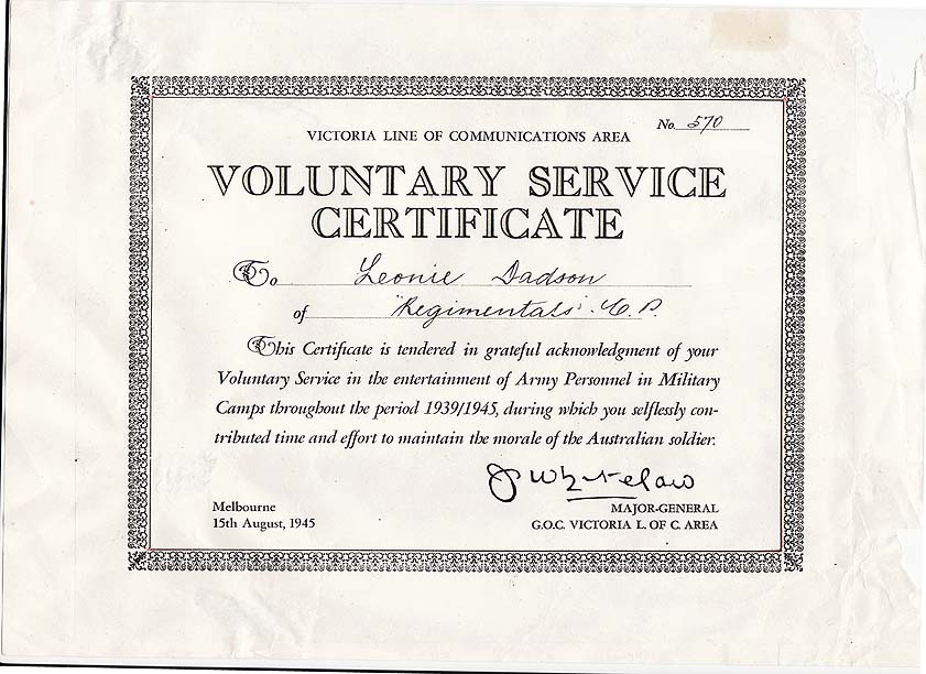 DESCRIPTIONPhotocopy of a voluntary service certificate issued by the Victoria Line of Communications Area to Leonie Dadson of “Regimentals C.P.” for voluntary service in the entertainment of Army Personnel in military camps throughout 1939/1945. Dated Melbourne 15th August 1945 and signed by J. Whitelaw