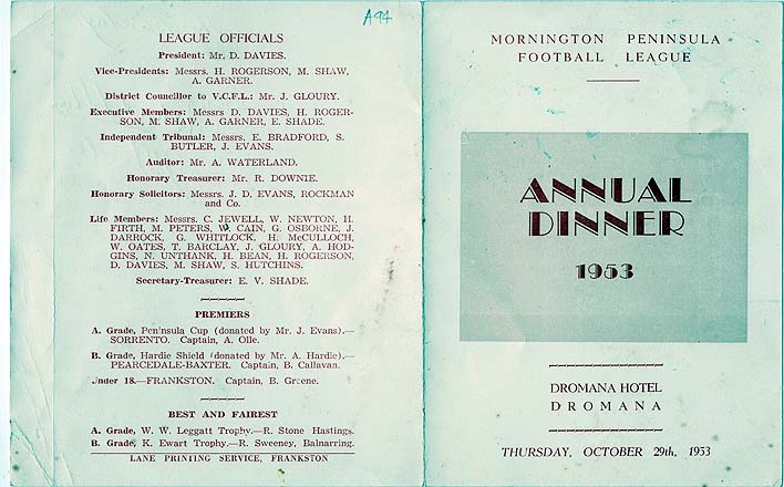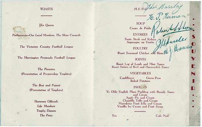 DESCRIPTIONA souvenir programme and menu of the Mornington Peninsula Football League annual dinner, held at the Dromana Hotel, Dromana, Thursday, October 29th, 1953. On the back is listed the League officials, the premiers (A Grade, Sorrento, A. Olle, B Grade, Pearcedale-Baxter, B. Callavan, Under 18, Frankston, B. Greene) and the best and fairest (A Grade, R. Stone, Hastings, B Grade, R. Sweeney, Balnarring. Life members: C. Jewell, W. Newton, H. Firth, M. Peters, W. Cain, G. Osborne, J. Darrock, G. Whitlock, H. McCulloch, W. Oates, T. Barclay, J. Gloury, A. Hodgins, N. Unthank, H. Bean, H. Rogerson, D. Davies, M. Shaw, S. Hutchins. Five signatures are inside: Thos Barclay, H.P. Herman, M.J. Homes, 2 illegible