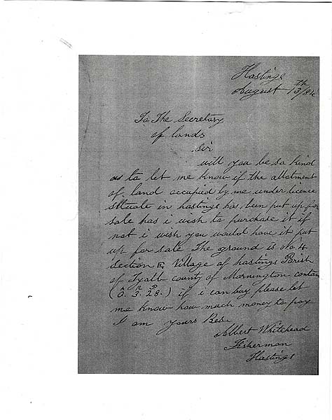 DESCRIPTIONPhotocopy of a letter written by Albert Whitehead, fisherman, of Hastings to the Secretary of Lands, asking if he could buy the allotment of land in Hastings he occupied under licence. The letter is dated August 13th/84