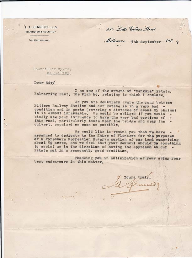 DESCRIPTIONA letter written by T.A. Kennedy, LL.B., Barrister & Solicitor, of 470 Little Collins Street, Melbourne, to Councillor Myers of Balnarring, requesting his assistance in repairing the road between Bittern Station and the Banksia Estate, Balnarring East, in which he lived. The letter is dated 5th September 1929