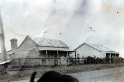 DESCRIPTIONThis image shows two weatherboard cottages with sloping roofs. The cottage on the left has a four posted verandah across the front. There are two windows on either side of the centre front door. One window is on the side of the building and part of a large chimney can be seen at the back. The building on the right has a three posted verandah across the front and a small window on the side. A front fence stretches across the front of the buildings and a grassy footpath and a gravel road is in the foreground. Part of a dog can be seen at the bottom of the image.