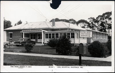 HISTORYThe Hastings Bush Nursing Hospital was officially opened on 17 July, 1930 by Sir James Barrett who was the founder and chairman of the Victorian Bush Nursing Association. The hospital opened with five beds for patients, a sitting room and a bedroom and a bedroom for the sole member of the nursing staff. Printed on the back of the postcard is: ‘Post Card A Real Photograph Produced in Australia’. Also written in black biro is ‘Jean Peters’.