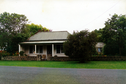 DESCRIPTIONThis image shows a timber house with a galvanized iron roof and a four post verandah across the front. A large set of windows are on either side of the front door. A low brick fence runs across the front between the house and the green grassed footpath. A bitumen road is in the foreground. A tree is on the footpath and large trees are on either side of the house. Part of a building showing a window can be seen between the trees on the right-hand side of the image. Colourful shrubs are behind the fence on the far left-hand side.