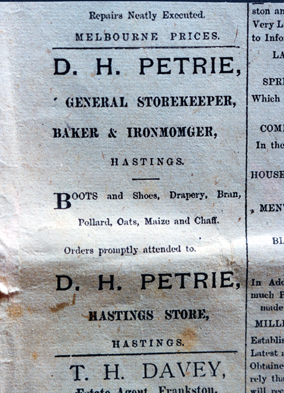 HISTORYThis photo was taken by Bruce Bennett for his publication. The advertisement appeared in the first issue of the Mornington Standard, 5th October 1889. It’s advertising the General Store owned by David Henry Petrie (1861 - 1932). Margaret Prosser married David Petrie after her husband Harry Prosser died.