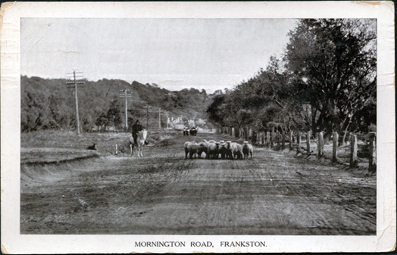 DESCRIPTIONThis image shows a wide dirt country road with a group of sheep standing in the centre. A man, dressed in dark clothing, sitting on a white horse, is to the left of the sheep. A dog is lying on the grass nearby. A group of people can be seen on the road in the background. A line of fence posts run along the right-hand side of the road and several tall poles run along the left-hand side of the road. Trees are on either side of the road and in the background. Printed on the border the bottom is: “Mornington Road, Frankston.”.