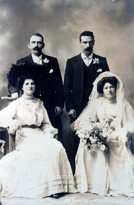 DESCRIPTIONThis image shows a wedding party of the bride and groom and their two attendants. The bride is sitting on the right and is holding a large bouquet of flowers on her lap. Her dark coloured hair is swept up high underneath a veil. Her dress has a high neck, long puffed sleeves and the long skirt has two rows of pleats around the bottom. Her bridesmaid, sitting beside her, is wearing a similar dress and has a dark coloured belt around her waist. She is wearing a large, dark coloured hat on the back of her head. The two men, standing behind the chairs, are wearing dark coloured three piece suits, white shirts, white handkerchiefs in their coat pockets and a flower in their coat lapel. They both have large moustaches.