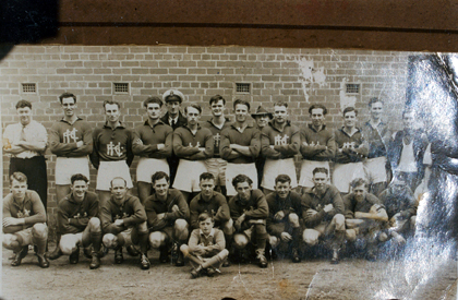 DESCRIPTIONThis image shows a football team, posing for a photo. There are ten players standing and ten players crouching on the ground at the front. A man in a white shirt and tie with a towel over his shoulder, is standing on the far left-hand side and a man in a dark coloured shirt, tie and white sleeveless jumper, holding a towel, is standing on the right-hand side. Two men, one with a sailor’s hat are standing at the back. A young boy is sitting cross-legged on the ground at the front of the group. A brick wall forms the background with an open doorway on the far right-hand side.