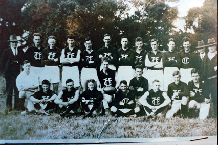 HISTORYThis is the Tyabb Football Club and the photo was taken in Hastings. The names of the men are as follows: Back row: Stan Thornell, Jack Covey, Bill Jerimia, George Walker, Tassie Petersen, Bob Torey, (Tyabb Shop owner), Alec Barkley, Reg Borley, Olli Petersen, Colin Mentiplay, George Slocombe and Arnold Noble. Front row: Umpire ?, Captain Benton, Norm Petersen, Bert Noble, Albert Taylor, School Teacher Aslop, George Williams and Ernie Walker. The original photograph was taken by George Williams and was copied/photographed by Dr Bruce Bennett for the purpose of research or publication.