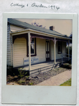DESCRIPTIONThis image shows the front of a timber cottage. Two windows are on either side of the panelled front door. A small verandah is across the front held up by three posts. A lacy wrought iron trim surrounds the verandah posts. An empty garden bed and a brick pathway are in front of the cottage. A sign is attached to the front wall which reads: “Shire of Hastings Historical Society Project”.