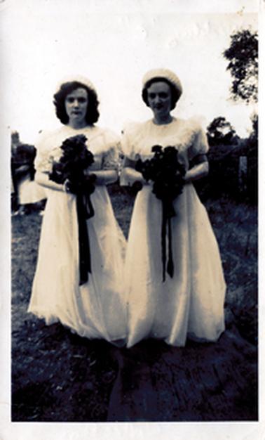 DESCRIPTIONThese two wedding photos show the bride and groom after the ceremony standing outside a building and the two bridesmaids standing side by side on the grass.